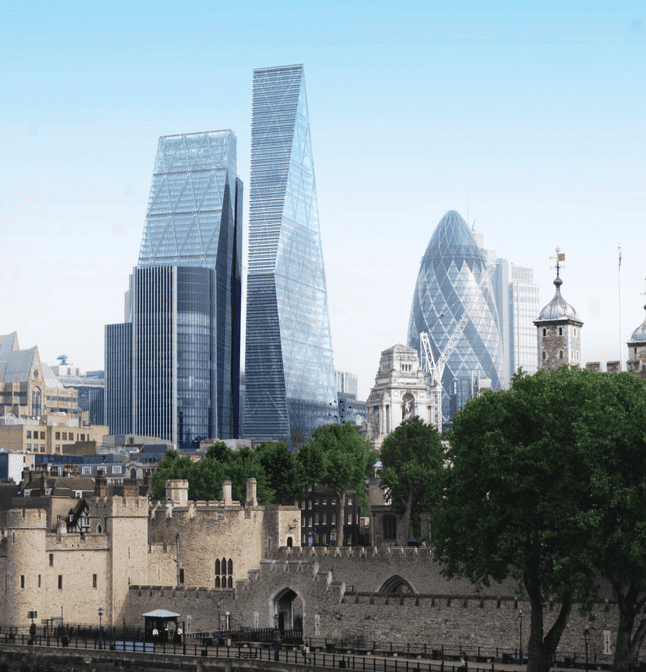 The architect has aimed to preserve the views of the nearby Gherkin with a building that has sloping sides and mirrors the Cheesgrater tower on its other side.