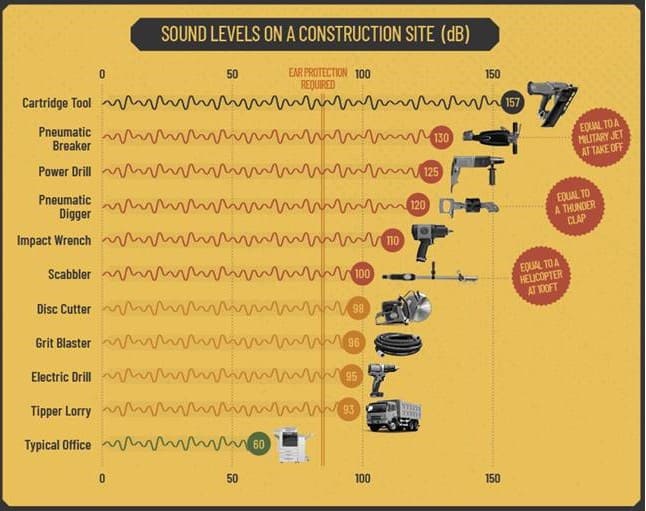 Also as a word of warning, being exposed to anything at 85bD or higher for extended periods of time can permanently damage your hearing. As you can see, every construction tool is above 85dB, which means that hearing protection should always be worn: