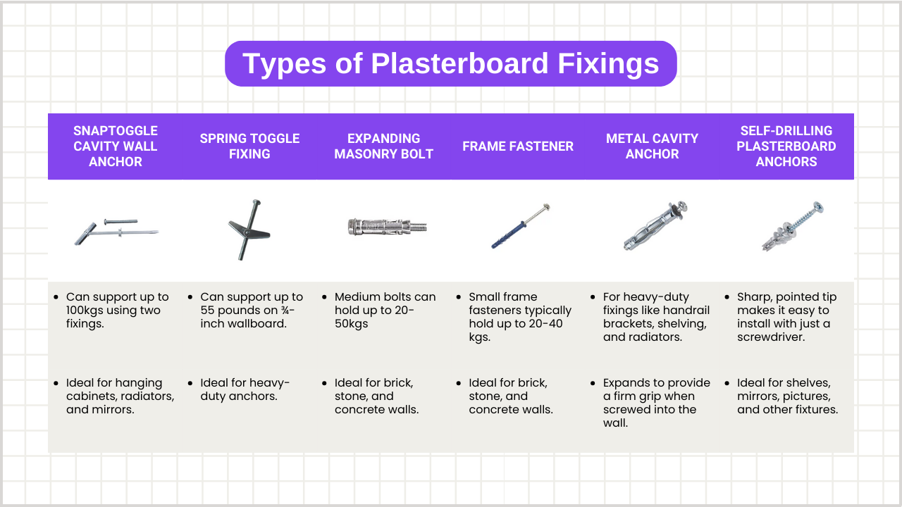 Plasterboard Fixings for Fibreboard and Other Wall Types