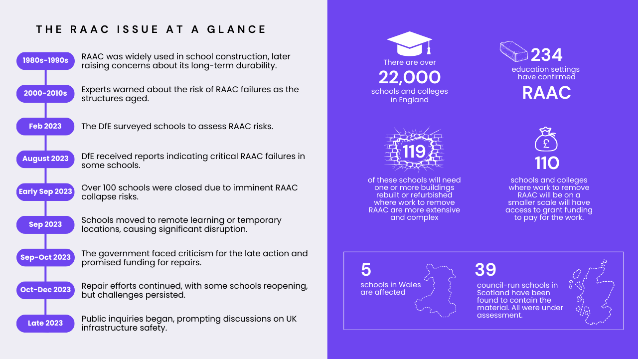 The Department for Education recently published a list of schools identified with collapse-prone reinforced autoclaved aerated concrete (RAAC) in England. This came after mounting pressure and calls for transparency. A total of 104 schools have had to close or partially close due to concerns about RAAC, in addition to 52 schools with already implemented measures to address the issue.