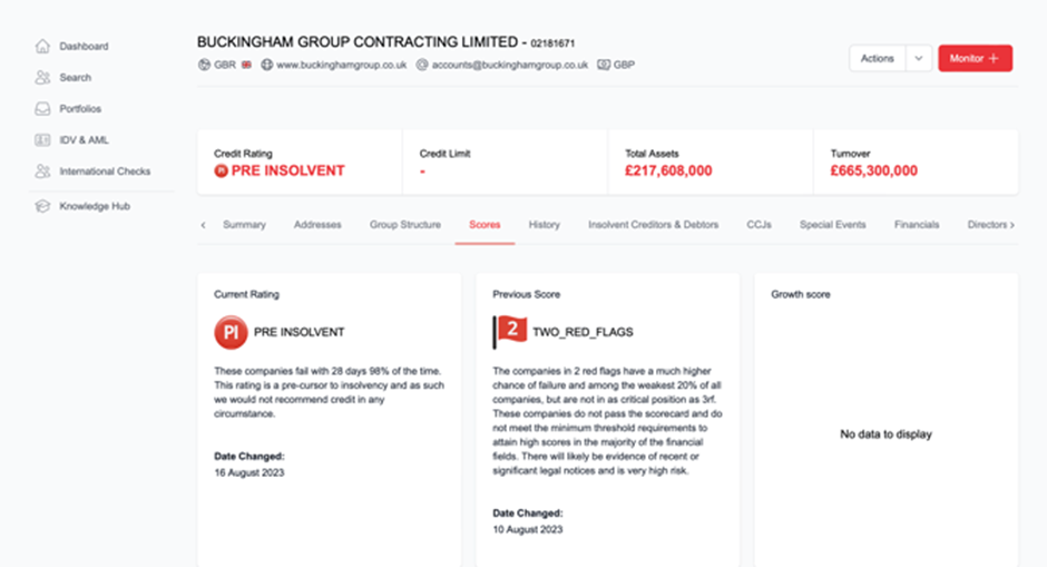 At 92% accuracy, Red Alert’s insolvency scoring is the most accurate currently available on the UK market. Many competitors didn’t notice the issues at Buckingham Group until much later in 2023, users were aware of the failings at the organisation, and that it was identified as high-risk, months before anyone else. Receipts were received at the end of the month while large payments to subcontractors were due earlier, contributing to a cashflow crisis that ultimately led to the company’s collapse. Companies that use Red Flag Alert can protect themselves and be aware of exactly who they are doing business with, to avoid unnecessary risk in an unstable environment. Want to find out more? Download the full report on the Buckingham Group.