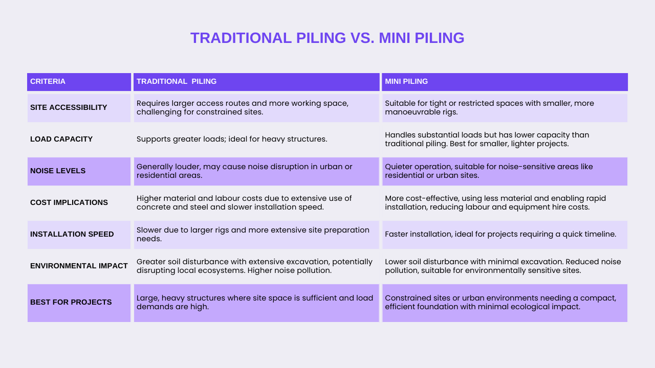Mini piling is more compact and quieter, making it well-suited for restricted and noise-sensitive areas. Traditional piling generally supports heavier loads but requires more space and larger equipment. Additionally, mini piling reduces the overall carbon footprint of construction projects by utilizing less concrete and steel compared to traditional piling. Both mini piling and traditional piling offer a range of piling solutions to meet different project requirements and site conditions.