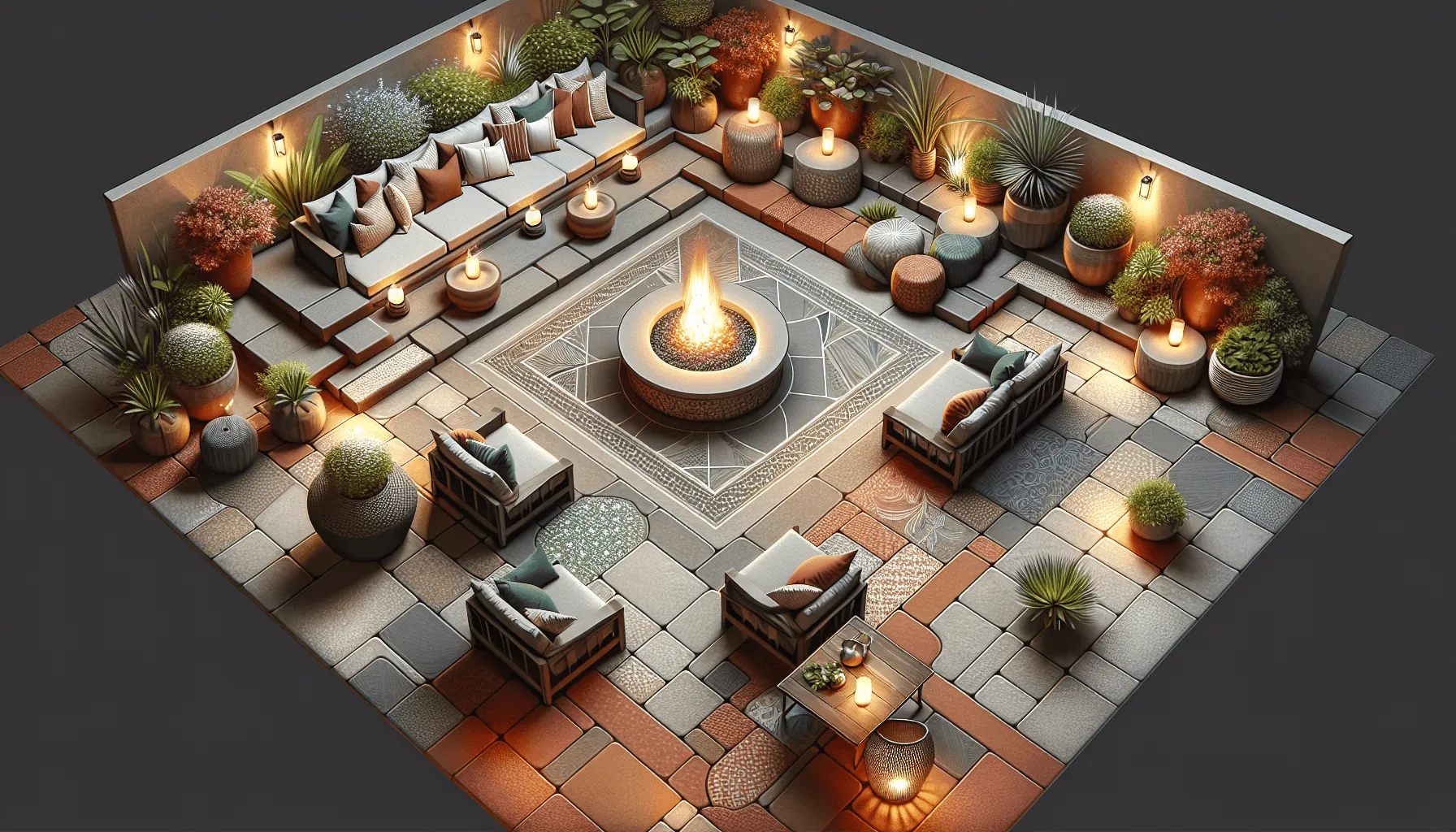 To further enhance the rustic feel, consider using materials like tiles, gravel, or sand as complementary elements—gravel or sand can be used between pavers or as a base for pathways, while decorative tiles can add character and texture to the patio surface.