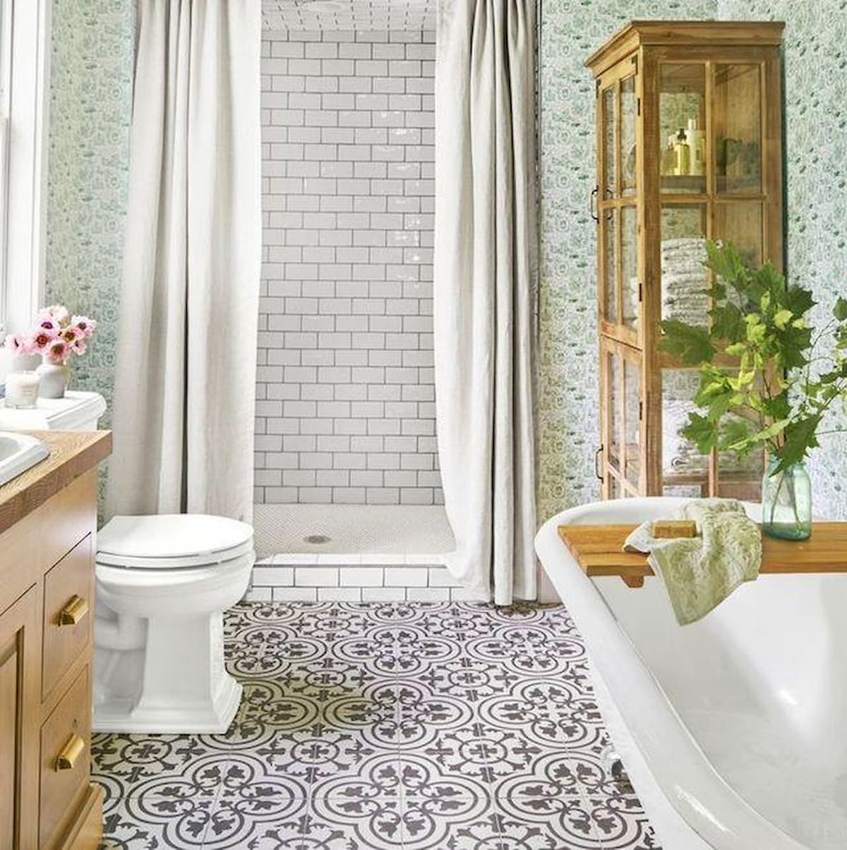 If your bathroom doesn’t have a window, then try putting curtains up anyway. You can hang them from the ceiling. This gives the impression that there’s a window there.