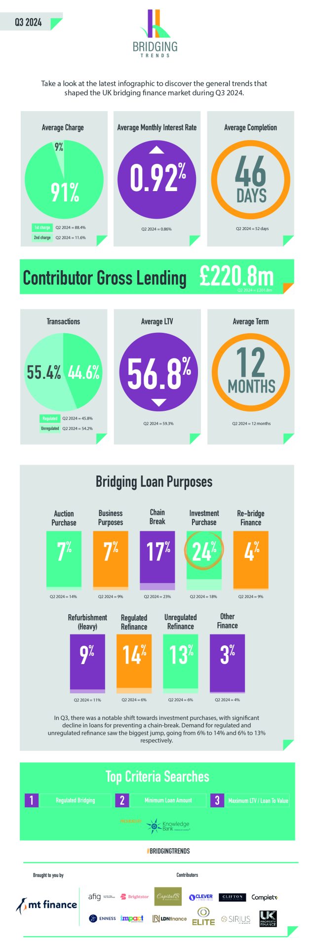 Bridging Trends combines bridging loan completions from several specialist finance packagers operating within the UK bridging market: AFIG, Brightstar Financial, Capital B, Clever Lending, Clifton Private Finance, Complete FS, Enness, Impact Specialist Finance, LDNfinance, Optimum Commercial, Sirius Finance and UK Property Finance. The data for top broker criteria searches is supplied by Knowledge Bank.
