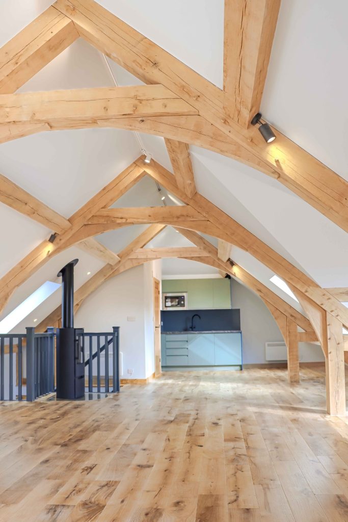 This type of living space above a garage with oak trusses offers a unique and charming aesthetic. The exposed wood beams add character and warmth to the space, creating a cozy atmosphere. The natural beauty of the oak trusses can be enhanced with the right lighting and decor choices, making it a truly inviting and stylish living area. Additionally, the practicality of having a separate living space above the garage provides privacy and separation from the main house, making it an ideal option for guests or as a rental unit. Overall, living in a space with oak trusses above a garage combines functionality with design, creating a one-of-a-kind living experience.