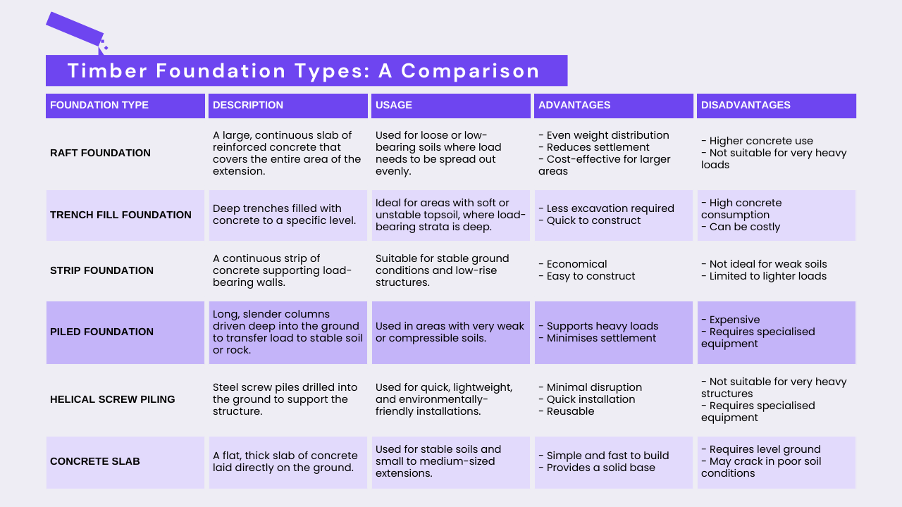 For timber frame extensions, suitable foundation types include shallow and deep foundations, as well as raft, strip, and trench-fill foundations. Consider the specific requirements of your project when choosing a foundation type.