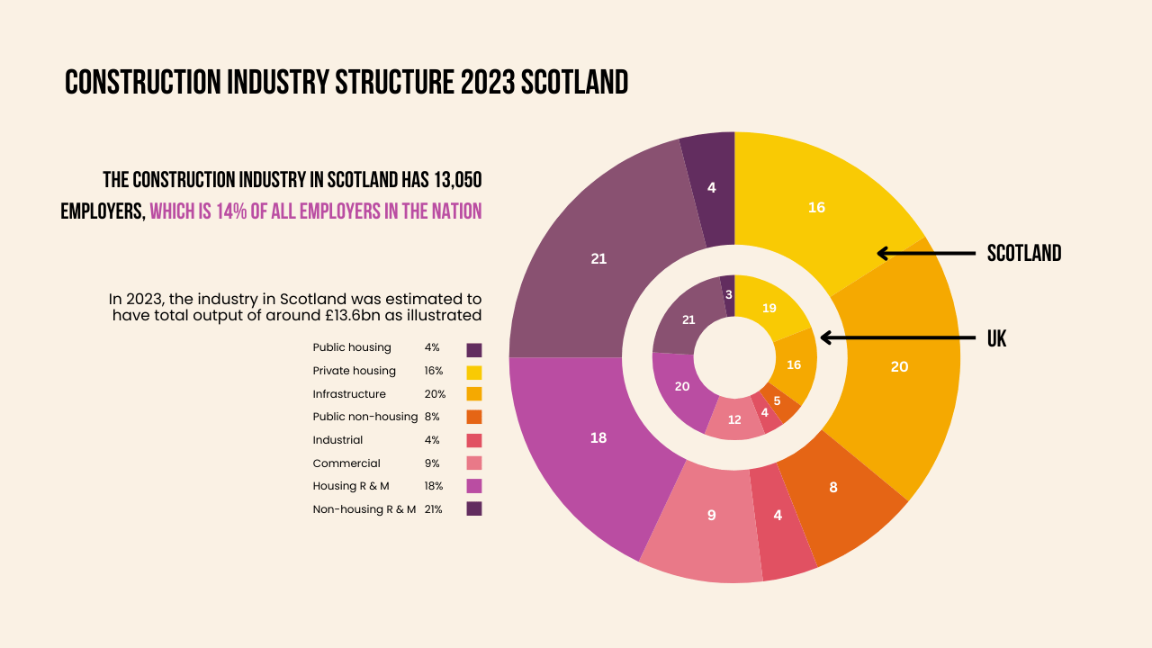 - Scotland’s construction sector includes 13,050 employers, contributing to 14% of all employers in the nation, with an estimated total output of £13.6 billion in 2023.